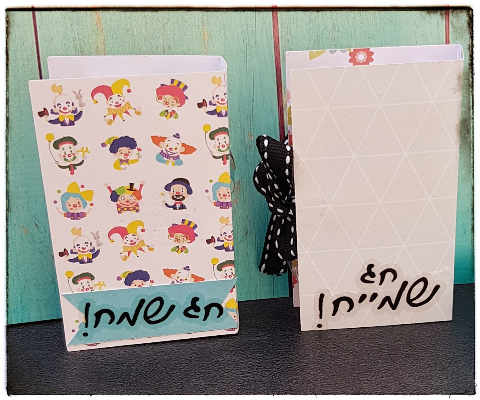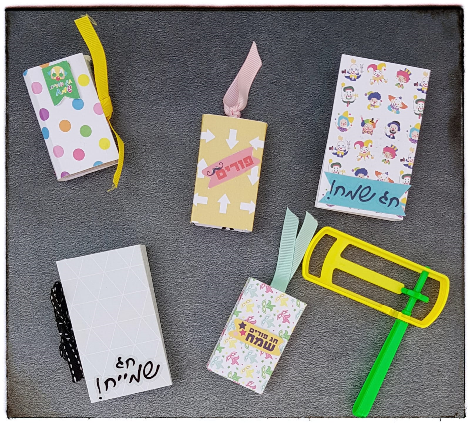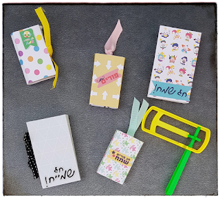 מכיוון שזה ממש תהליך הכנה מהיר, הכנתי כמה כאלה בשיטת הסרט הנע, גיוונתי בניירות (שאריות רבותיי, שאריות), בסרטים וכמובן בברכות ובמדבקות האיחולים
