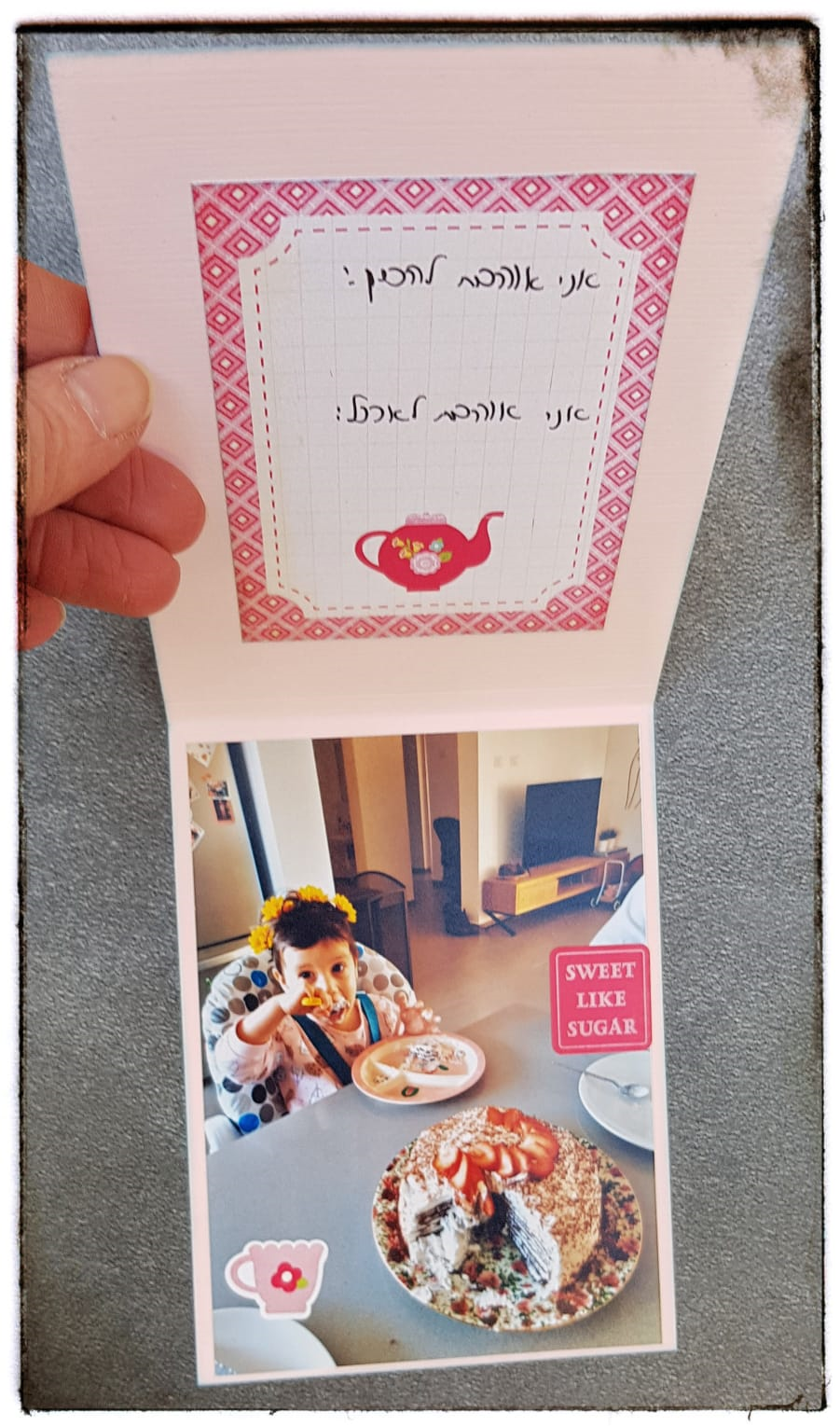 הכנסתי גם פלאפ אחד פשוט לתפעול, כי הילדונת הזו מאודדדד אוהבת תמונות שלה והיה לי ברור שהיא תבחן את כולם לעומק, ויחד עם זאת בעדינות מירבית. ולכן דאגתי שהפלאפ יהיה קשיח יותר ועמיד גם לידיים קטנטנות.