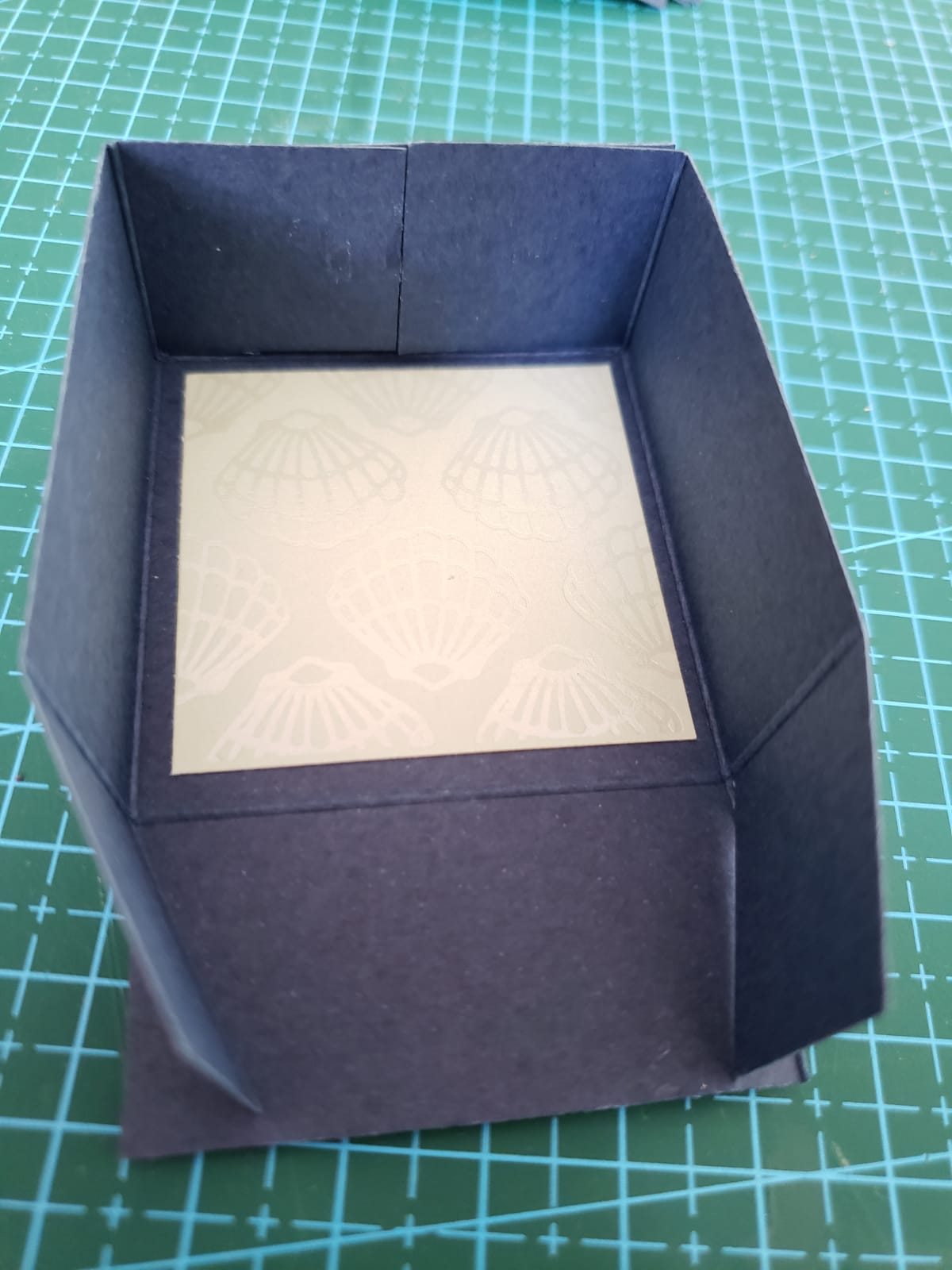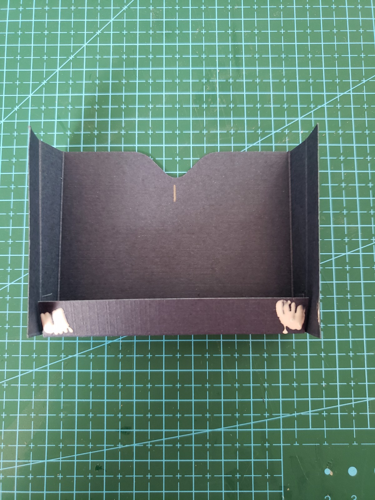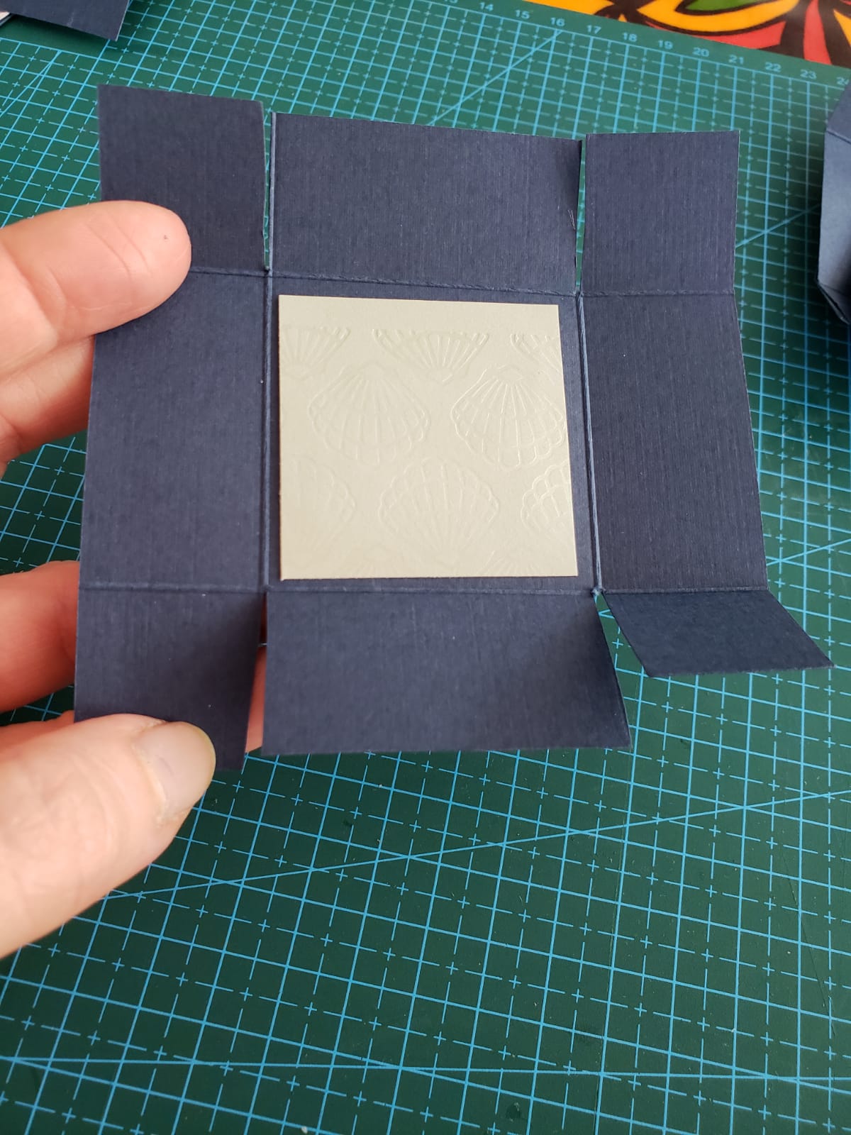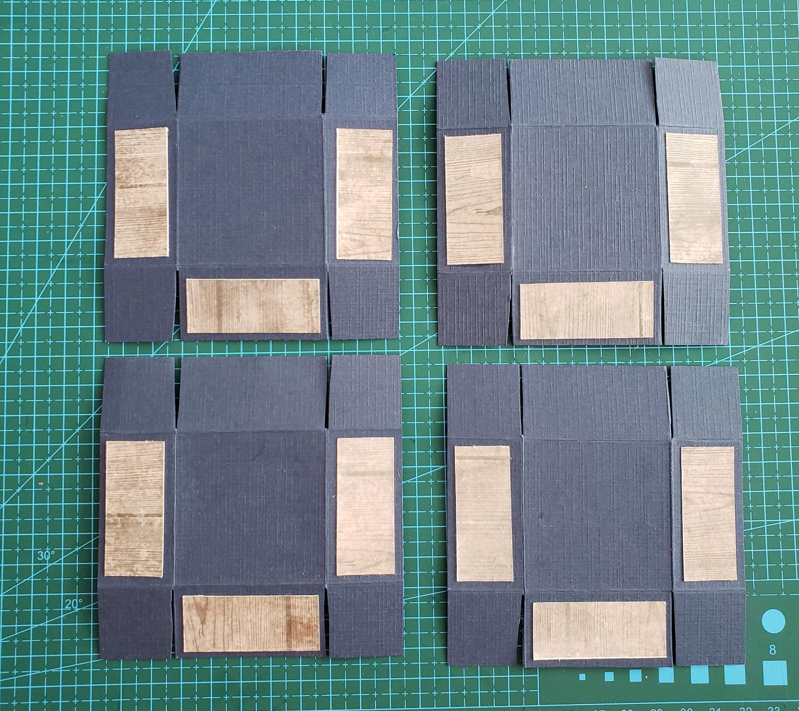 9.     ניקח את החלק שעוטף את המגירה (⅛2 על ¼7 אינץ'), נחזק את קווי הקיפול שלו, ועל החלק האמצעי, נדביק את המדוגם כשהוא פונה כלפי חוץ. נעשה זאת עם כל ארבע היחידות.