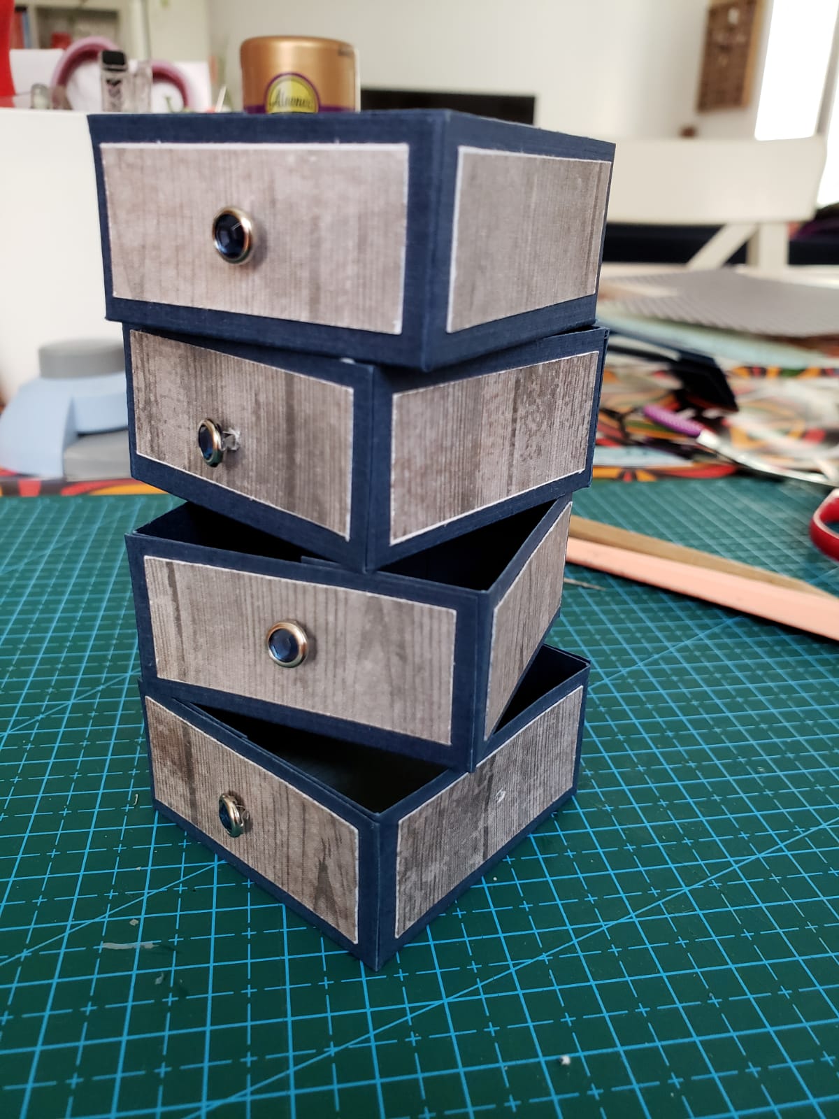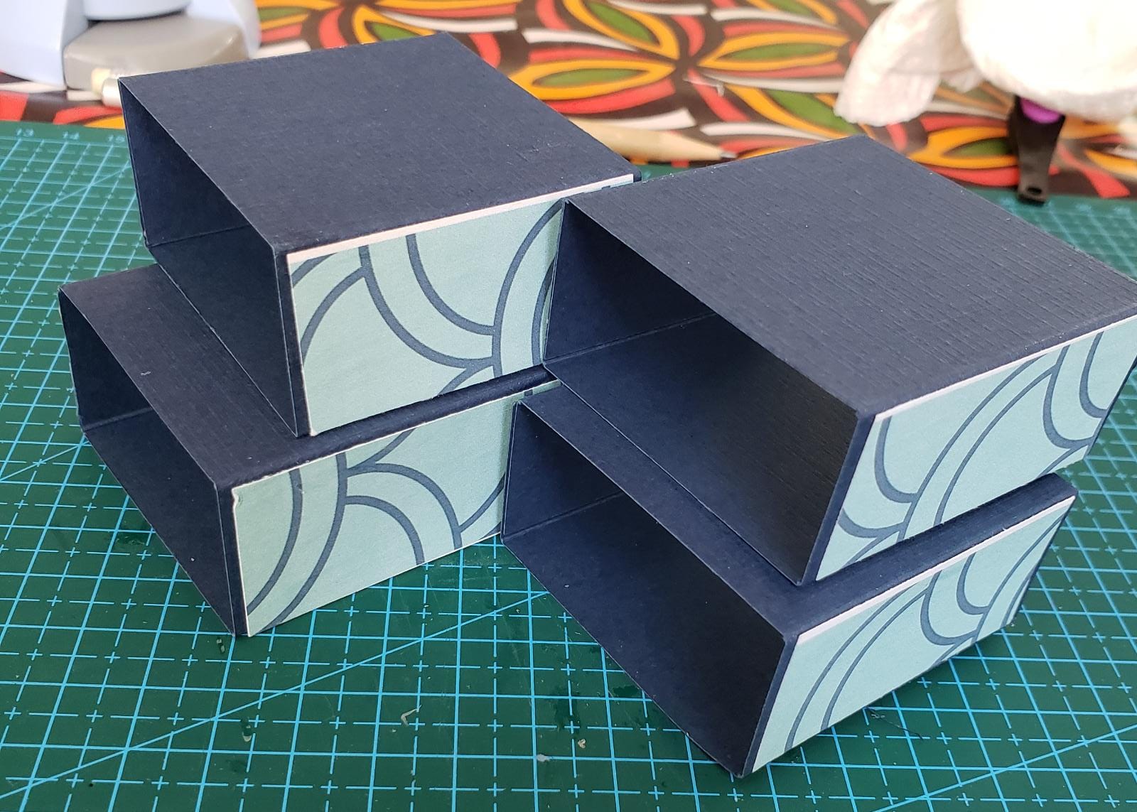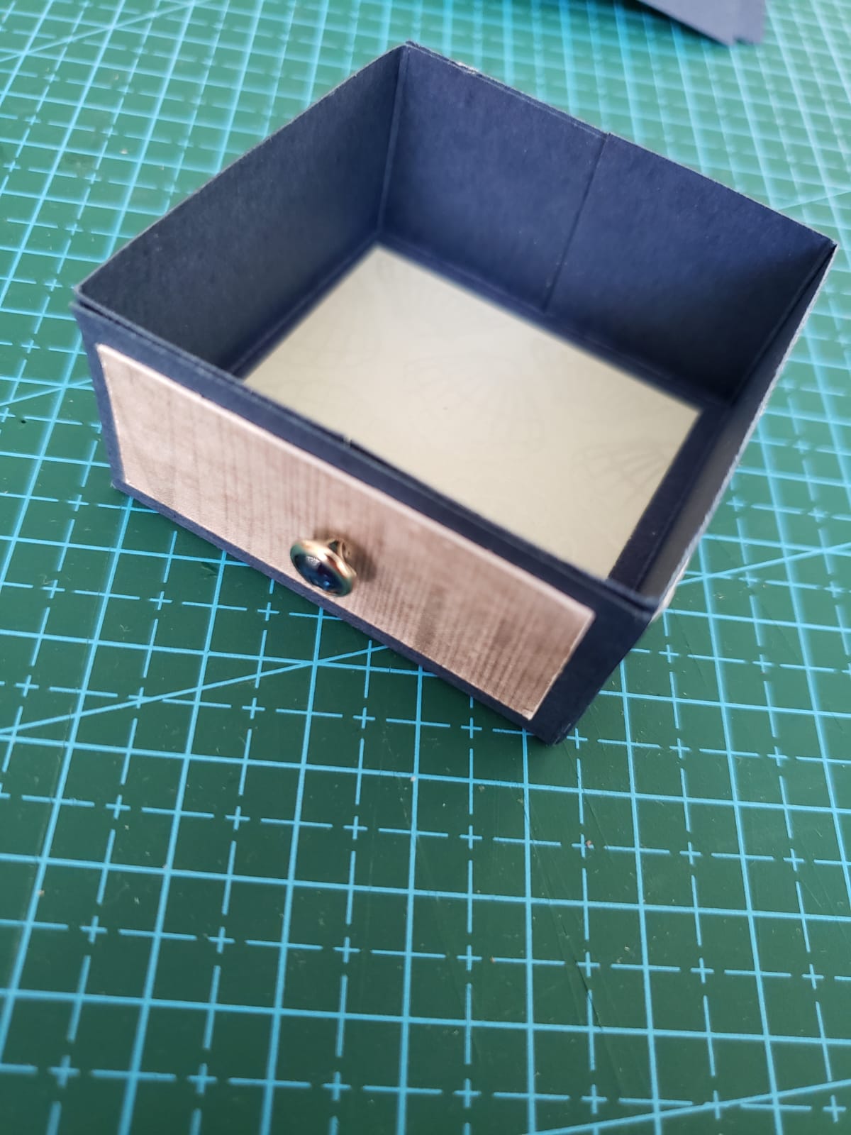 13.  נוציא את המגירות מהמעטפת שלהן, נדביק כל מעטפת בעזרת דבק נוזלי, למיקומה על הריבוע. את שתי המגירות שנושקות זו לזו אפשר להדביק גם בחלק הפנימי לטובת חיזוק ויציבות