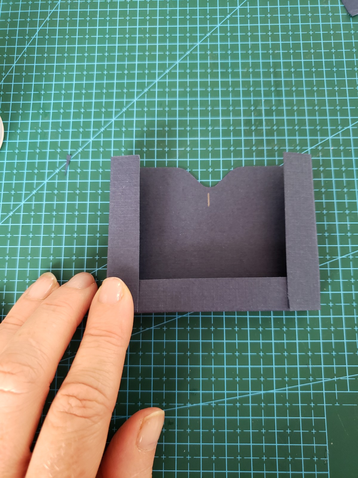 4.     נמצא את אמצעו של החלק החיצוני הקדמי – היכן שתמוקם הידית (אצלי המיקום לרוחב הוא ב1 אינץ' ובגובה ב ½ אינץ'), נסמן + קטן ובעזרת מחט/סיכה/מחורר, נייצר חור קטן. נרחיב אותו מעט מהחוץ כלפי פנים כדי לא לקרוע את הנייר המדוגם.