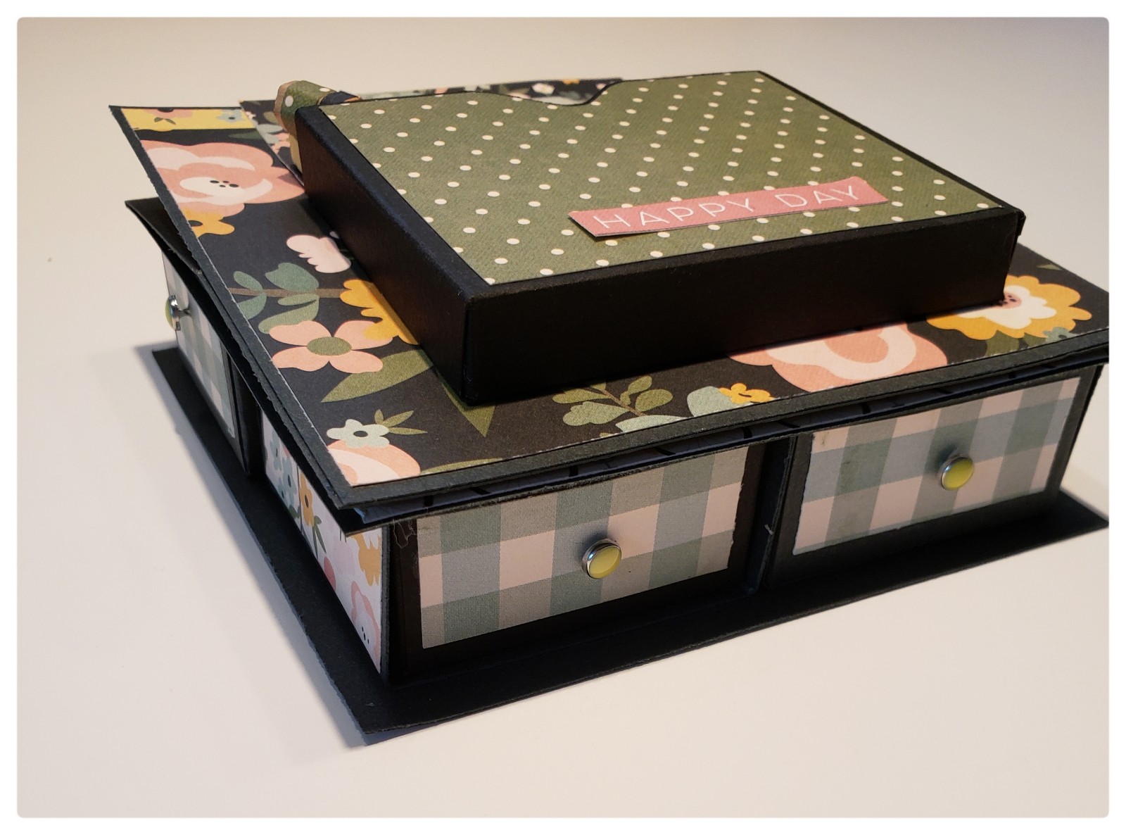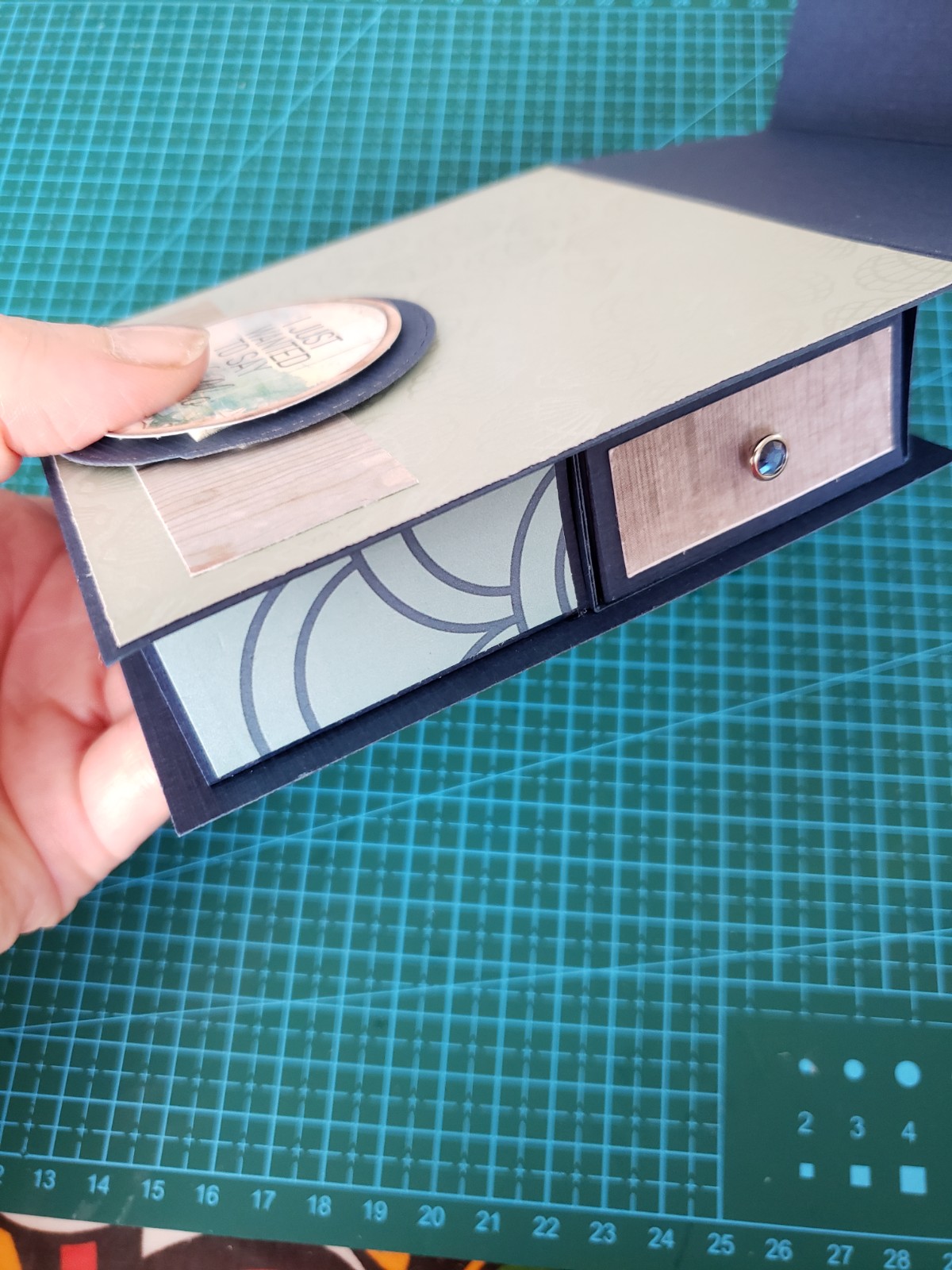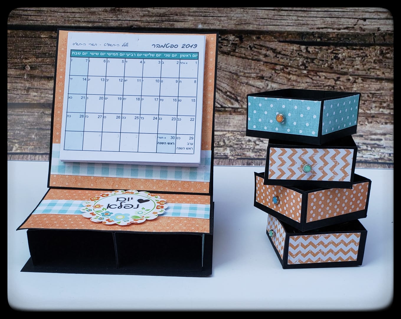 מעל המגירות יושב חלק אלכסוני (Easel Card) , שאליו הצמדתי את לוח השנה. הדבקתי את חודשי השנה מראש, היטב וכך הוא הפך להיות לוח תליש.