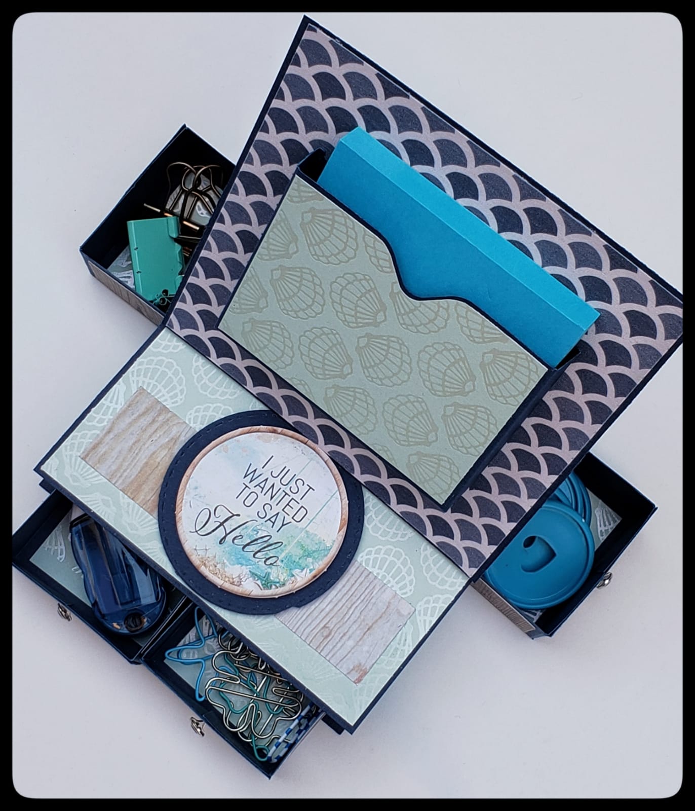 מעל המגירות יושב חלק אלכסוני (Easel Card) , שאליו הצמדתי את לוח השנה. הדבקתי את חודשי השנה מראש, היטב וכך הוא הפך להיות לוח תליש.