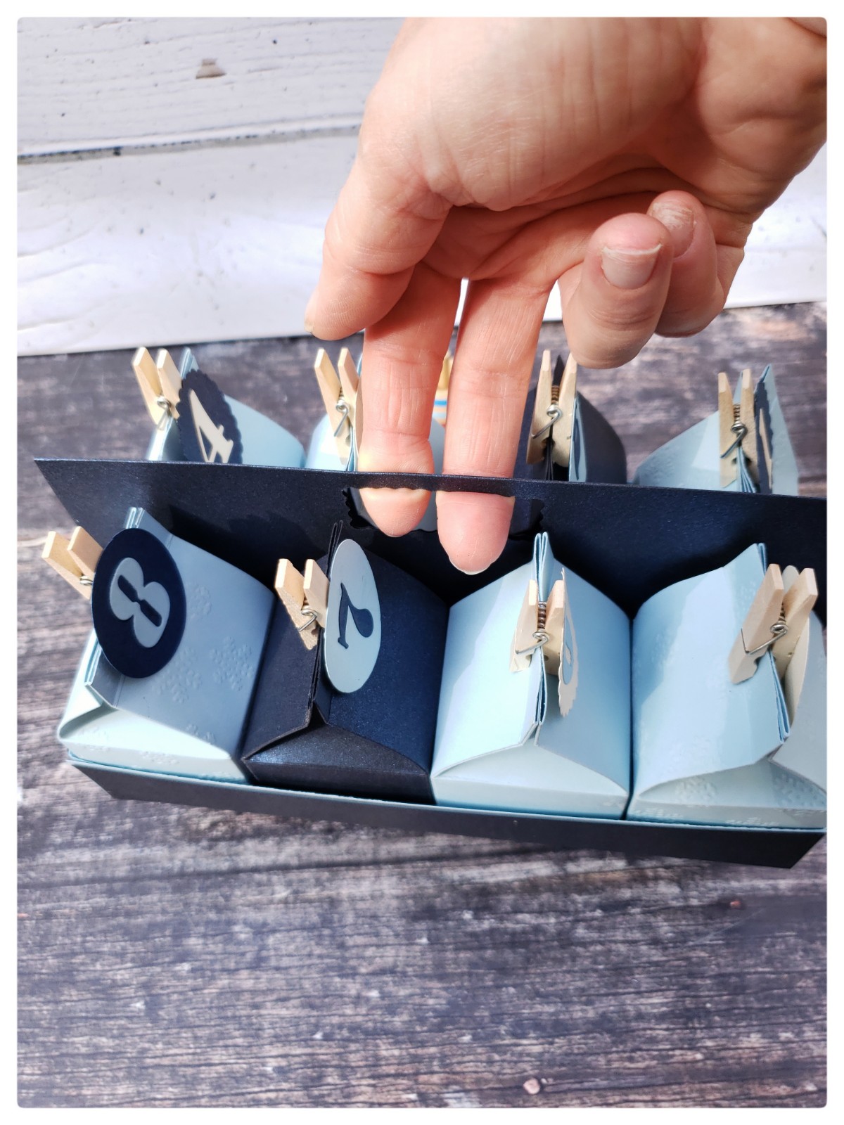 הרעיון מצא חן בעיניי, והחלטתי להתאים את המסורת תוך שינוי קל של הקונספט שלה. יצרתי מארז שמכיל 8 קופסאות קטנות, שנסגרות עם אטב, עם מספרים עליהן ובתוך כל אחת ניתן להחביא הפתעה מכל סוג שתרצו.