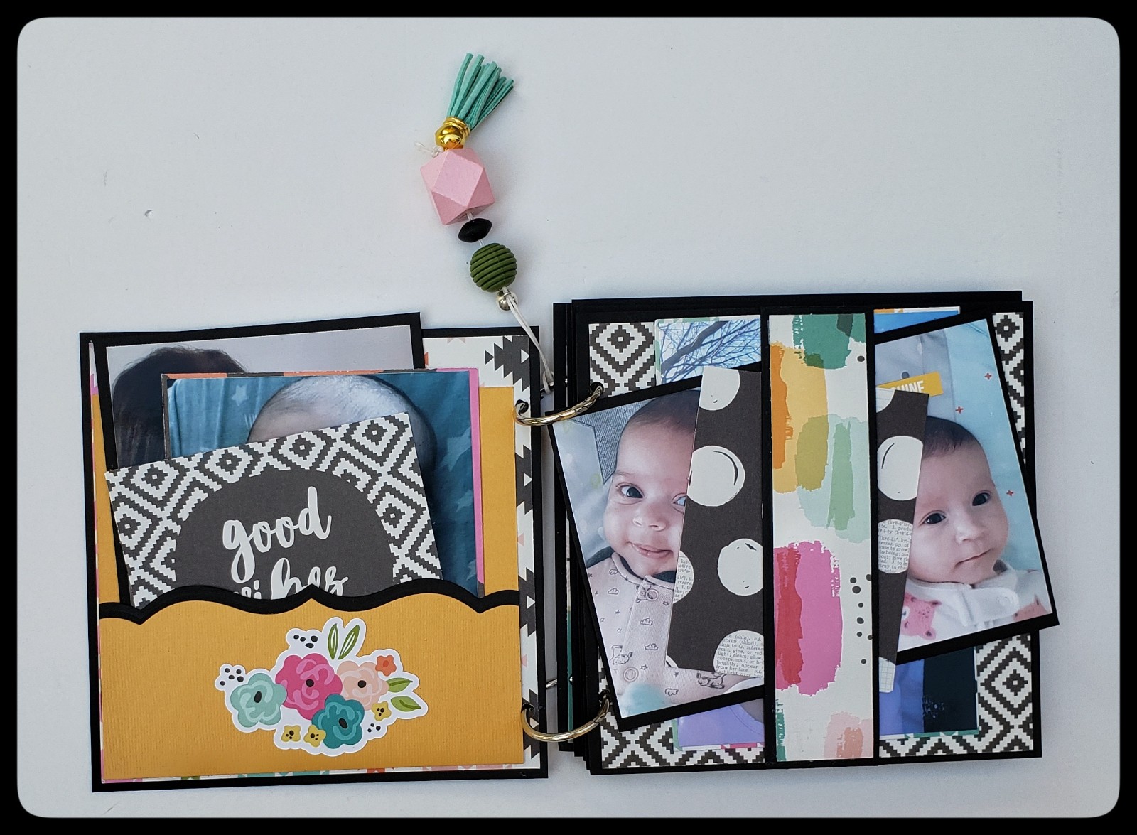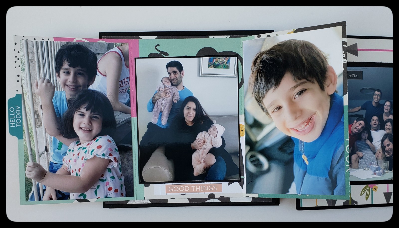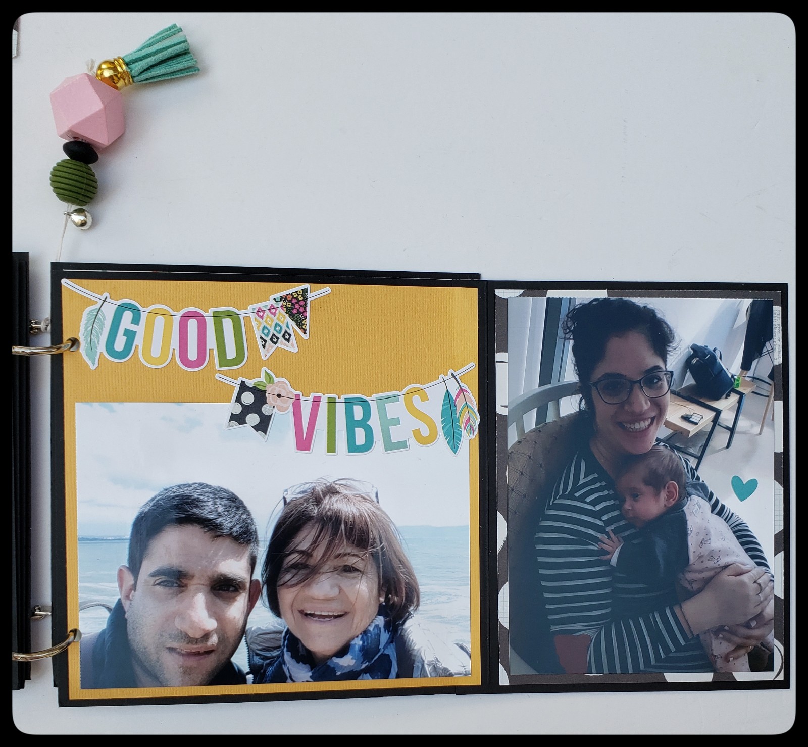 בדף הראשון וכדי ממש לשמח, מיקמתי את אחת התמונות המשפחתיות הנהדרות שקיבלתי מהמזמינה, יחד עם מאטינג שחור שבעצם תוחם את התמונה ומקפיץ אותה מתוך הדף המדוגם ותוספת מדבקה.